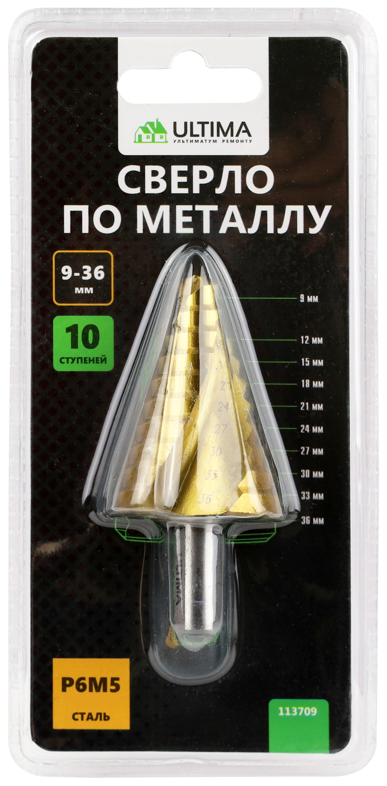 Сверло по металлу ступенчатое, Ultima, 9-36 мм, 10 ступеней, сталь P6M5