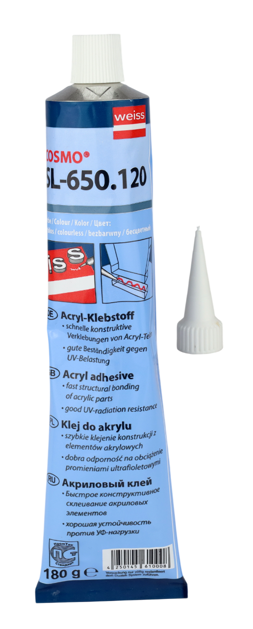 COSMO SL-650.120 прекрасно подходит для быстрого конструкционного склеивания деталей из акрила и отличается, прежде всего, хорошей устойчивостью к тепловым нагрузкам и к УФ-нагрузке.
