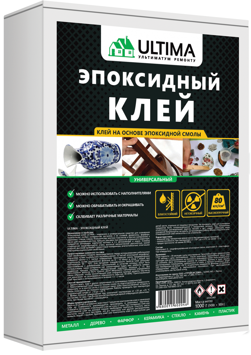 ULTIMA – двухкомпонентный клей на основе эпоксидной смолы. Применяется для склеивания металлов и их сплавов, древесины, керамики, фарфора, стекла, декоративно-облицовочных и других материалов, а также для заделки пор, трещин, раковин при ремонте домашнего инвентаря, автомобилей.