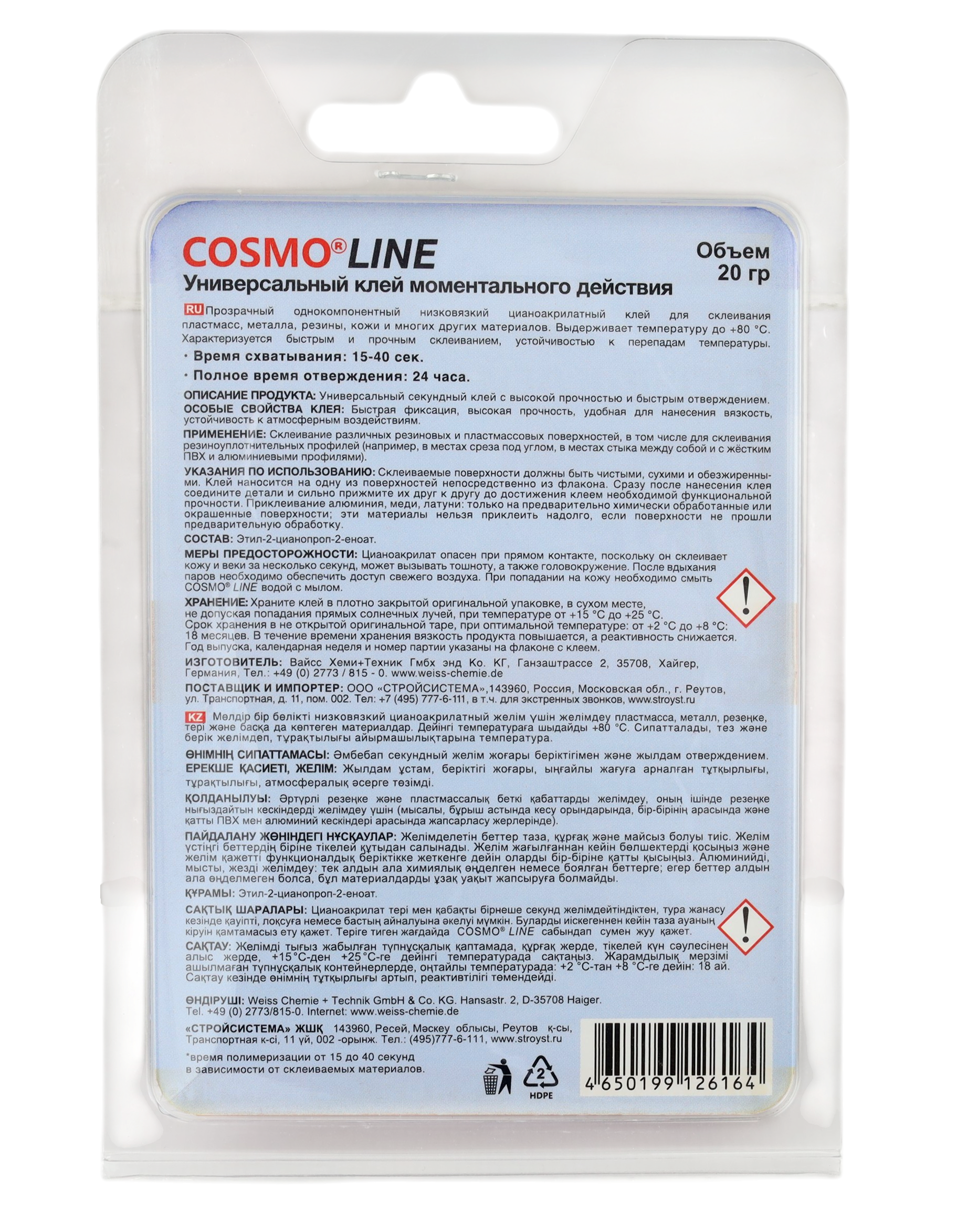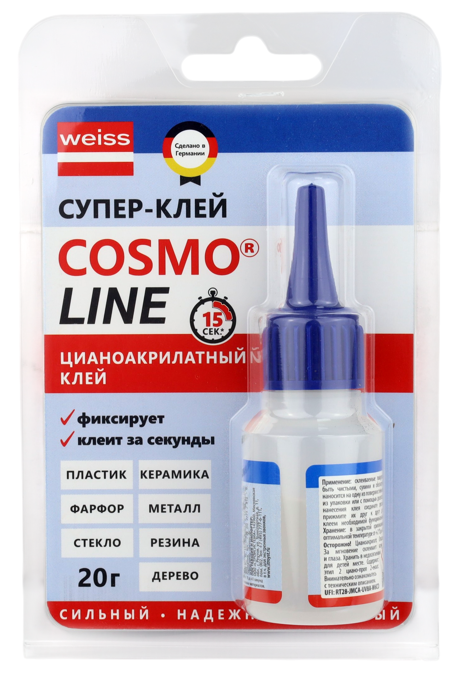 Прозрачный однокомпонентный низковязкий цианоакрилатный клей для склеивания пластмасс, металла, резины, кожи и многих других материалов. Быстрая фиксация, высокая прочность, удобная для нанесения вязкость, устойчивость к атмосферным воздействиям.