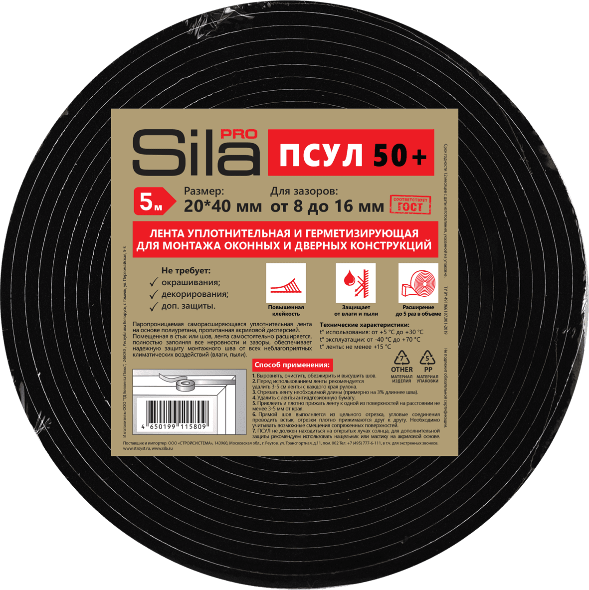 Sila Pro ПСУЛ 50+ - саморасширяющаяся самоклеящаяся эластичная герметизирующая диффузионная лента на основе вспененного полиуретана, пропитанная водоотталкивающей акриловой дисперсией.