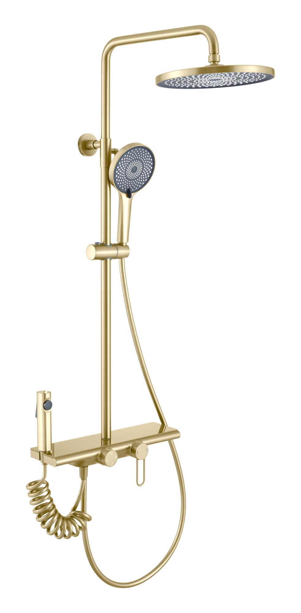 Душевая стойка KABRERA в матовом золоте оснащена латунным смесителем с керамическим картриджем 30 мм и пластиковым аэратором увеличенной проходимости. В комплект входит усиленный ПВХ шланг No Twist длиной 1,5 м, подвижный держатель лейки и ручная душевая лейка диаметром 130 мм. Верхний душ имеет диаметр 255 мм, а высота стойки составляет 125 см. Также предусмотрен керамический дивертор и комплект крепления. Артикул: 37294KBG.