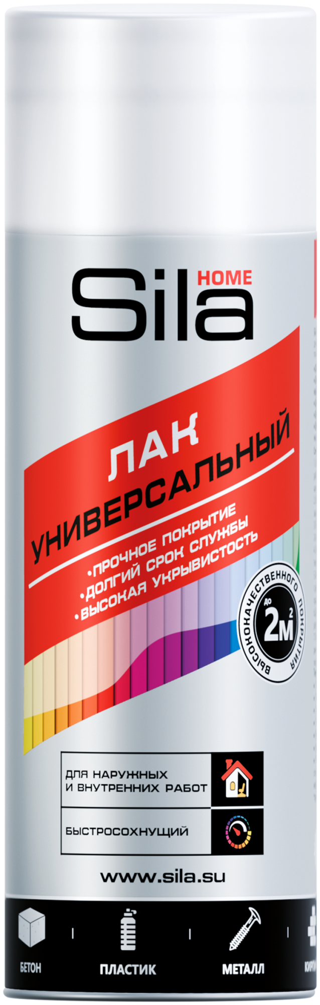 Аэрозольный быстросохнущий акриловый лак SILA предназначен для создания матового или глянцевого защитного и декоративного покрытия, окрашенного любым типом эмалей: акриловой, алкидной, нитроцеллюлозной и другими. Также подходит для неокрашенных поверхностей.